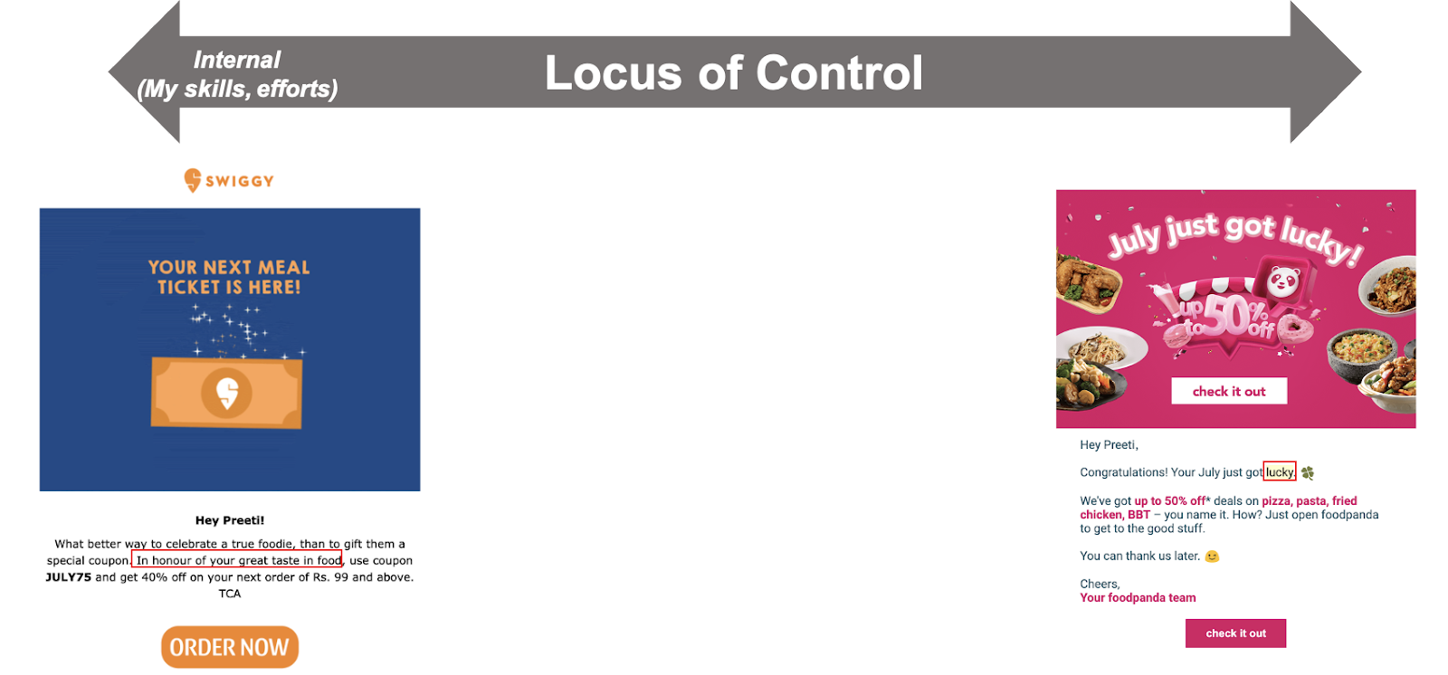 L'offre de gauche est une offre que j'ai reçue d'une société de livraison de nourriture en Inde. Ils ont conclu l'affaire avec les mots "En l'honneur de votre grand goût pour la nourriture" - Bien sûr que j'ai un grand goût pour la nourriture, et bien sûr que je suis un vrai gastronome, c'est pourquoi je mérite le bon de réduction. L'autre extrémité de ce spectre consiste à attribuer les réductions à des facteurs externes tels que la chance.