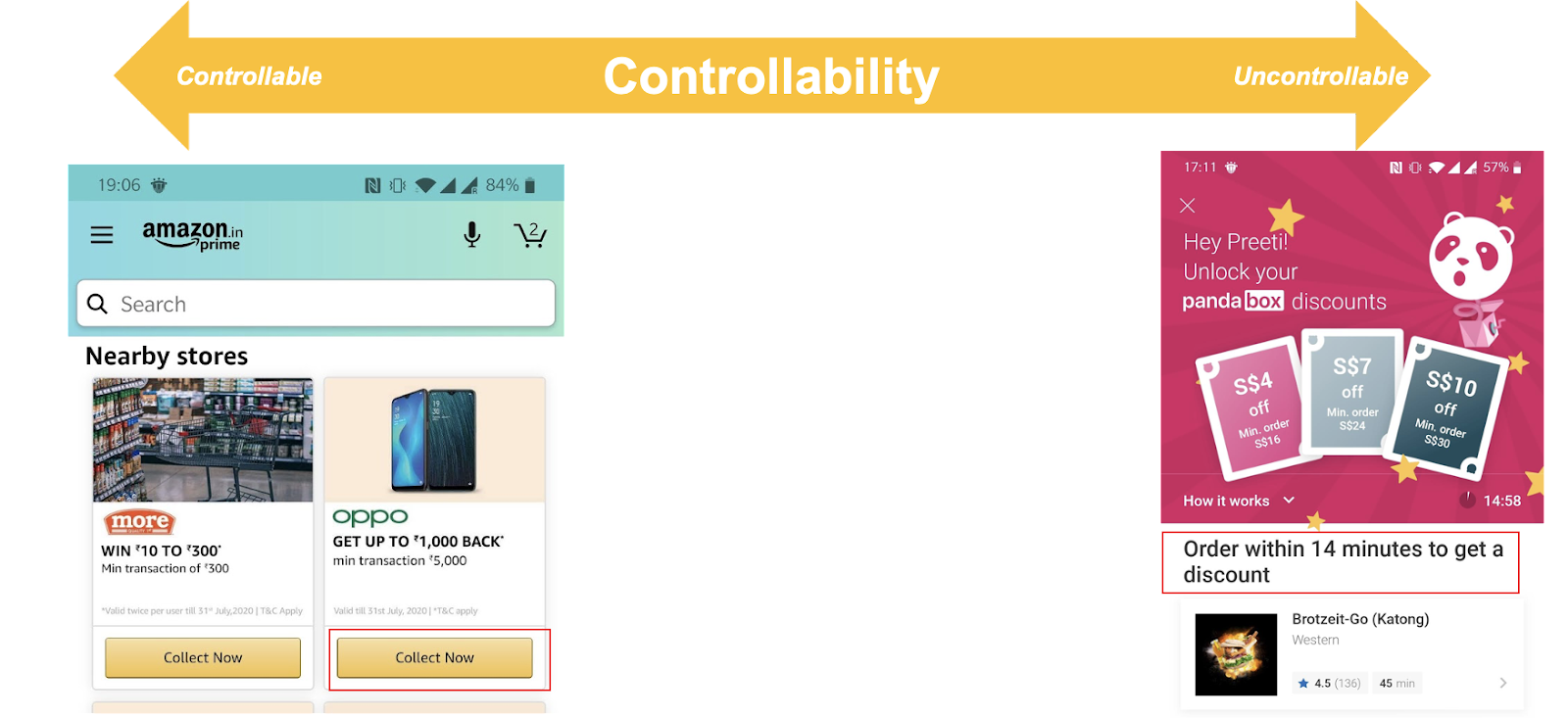 Du côté gauche du spectre, Amazon donne aux clients le sentiment d'une plus grande maîtrise en leur permettant de "collecter" l'offre maintenant et de décider quand ils souhaitent l'utiliser. À droite du spectre, une offre d'une société de livraison de nourriture est assortie d'une pression temporelle de 14 minutes. Si j'ai vraiment envie de ce hamburger, mais que je viens de déjeuner, ma seule option est de laisser tomber l'offre et d'avoir des remords.
