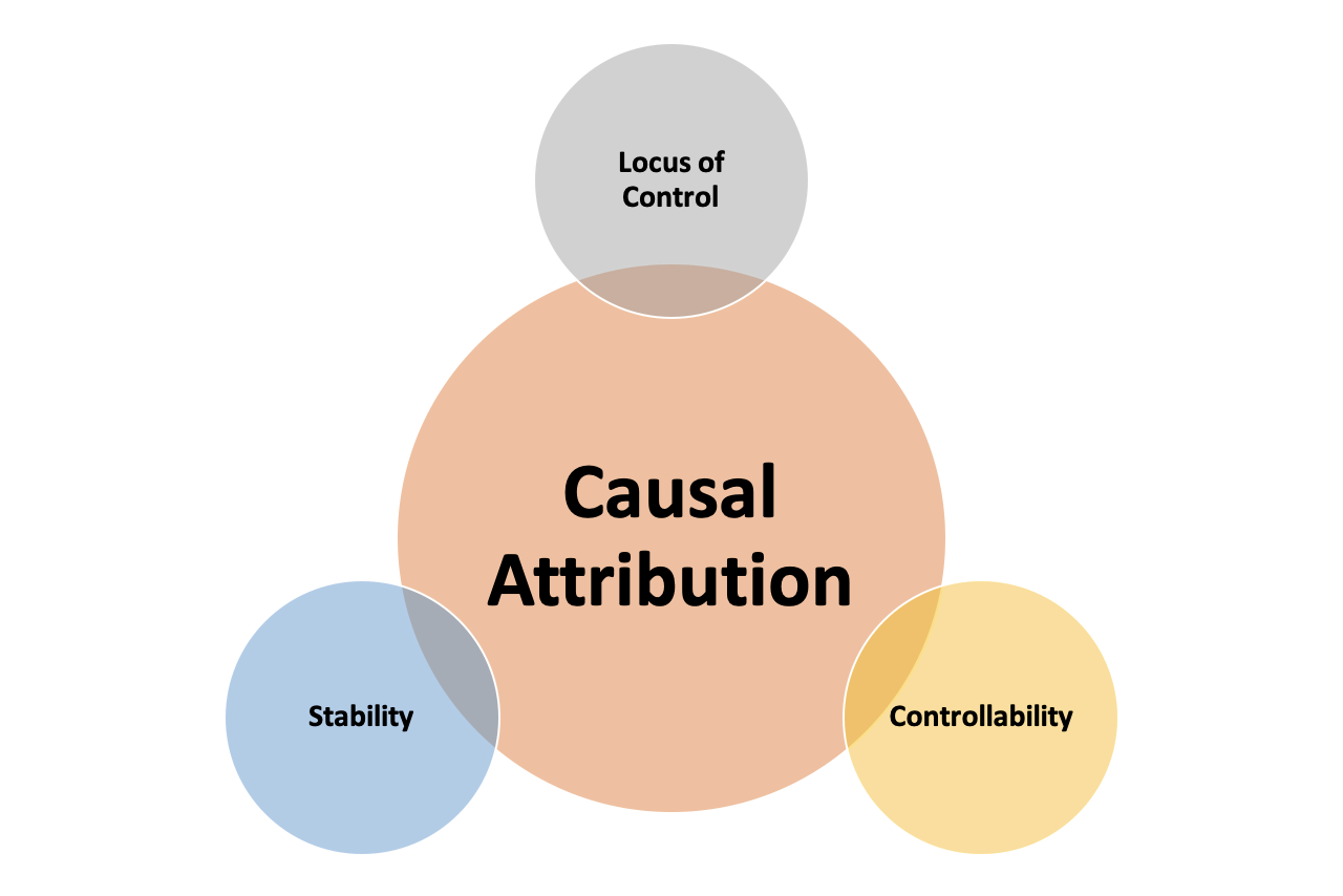 La recherche en psychologie sociale a identifié trois dimensions des attributions causales : le locus de contrôle, la contrôlabilité et la stabilité4.