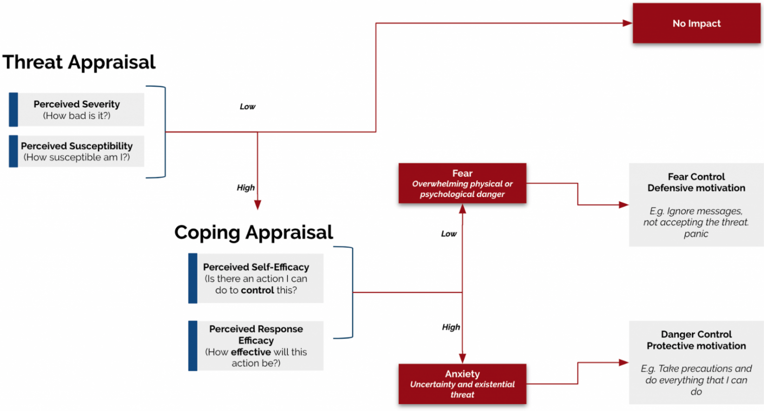 Comme le montre le cadre, une faible menace perçue n'entraînerait aucune réaction. Une menace perçue élevée, associée à une efficacité perçue faible, conduirait à un "contrôle de la peur", ce qui a souvent pour effet d'ignorer le message. Les histoires horribles de personnes qui partent en vacances de printemps, au mépris des recommandations des autorités sanitaires, en sont un exemple. Dans ce cas, la menace perçue est élevée, car les récits de cas croissants sont nombreux. La simple idée de rester chez soi peut sembler difficile et inefficace pour un jeune étudiant qui vit pleinement sa vie avec ses amis. Cette idée conduit à une approche de "motivation défensive" - "Je préfère ignorer cette menace et profiter de mes vacances de printemps".