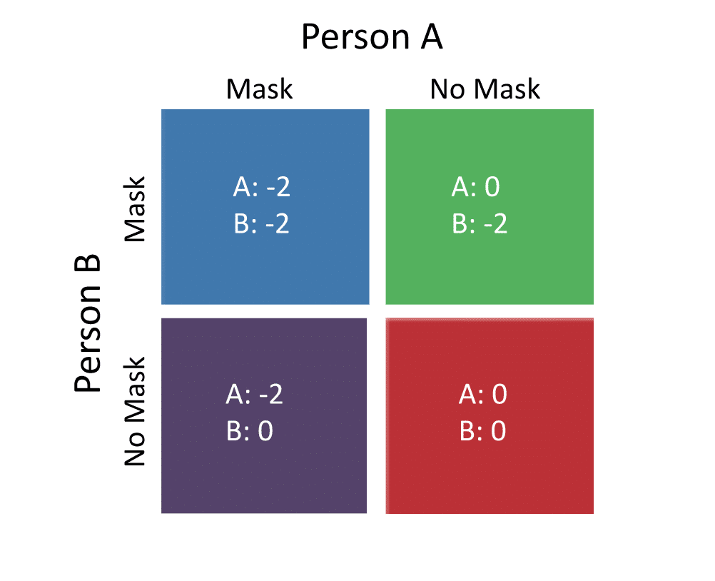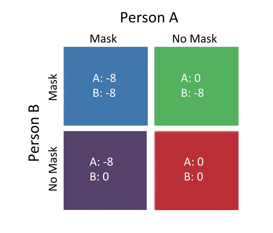 Le modèle ci-dessus représente visuellement cette situation. La valeur 10 a été arbitrairement attribuée au bénéfice pour la santé du port d'un masque par l'autre individu, tandis que la valeur -2 a été attribuée au coût du port d'un masque. Alors que le résultat le plus efficace est que les deux individus portent un masque (8,8), le résultat final est en fait (0,0).