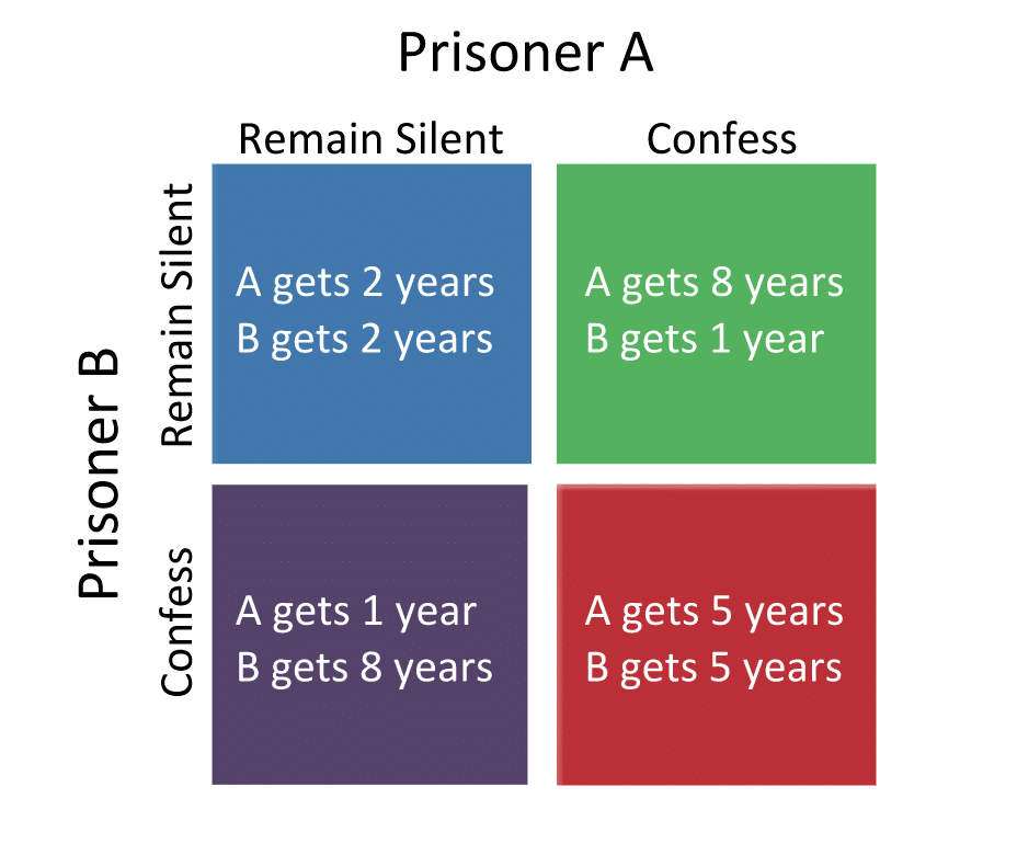 Dans ce jeu, deux braqueurs de banque appréhendés (Brendan et Jackson) ont été placés dans des pièces séparées afin qu'ils ne puissent pas communiquer entre eux. Chacun d'entre eux a deux options : avouer ou garder le silence. Si Brendan et Jackson gardent le silence, ils sont condamnés à une peine de deux ans chacun. En revanche, si Brendan avoue et que Jackson garde le silence, Brendan ne sera condamné qu'à un an de prison, tandis que Jackson se verra infliger une peine de huit ans. Et vice versa. Si les deux avouent, ils sont tous deux condamnés à une peine de 5 ans. Le modèle ci-dessous représente visuellement ce jeu.