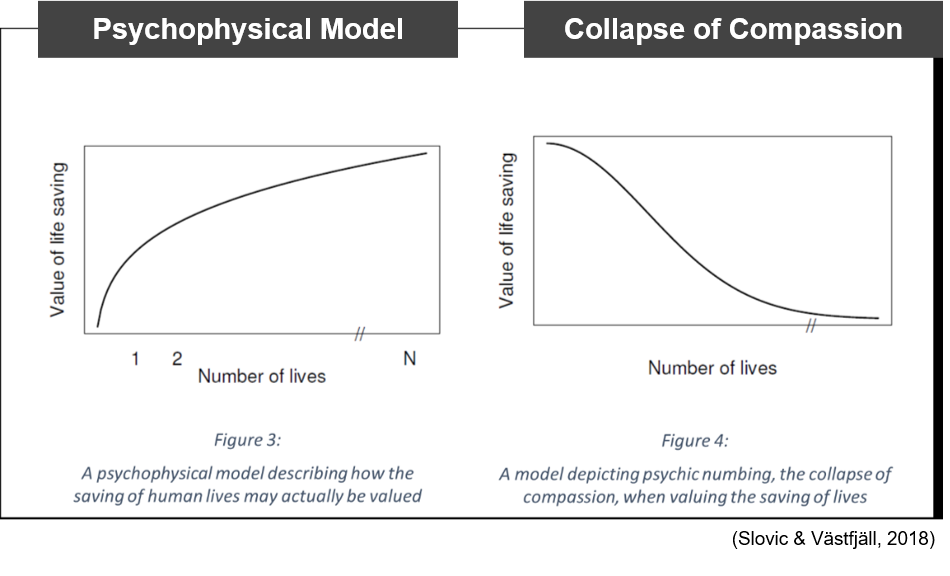 Slovic, P. (2010). If I Look at the Mass I Will Never Act: Psychic NumbingPsychic Numbing and GenocideGenocide, 2(2), 37–59. https://doi.org/10.1007/978-90-481-8647-1_3 - Slovic, P., & Västfjäll, D. (2018). The More Who Die, the Less We Care Psychic Numbing and Genocide31, 94–114.