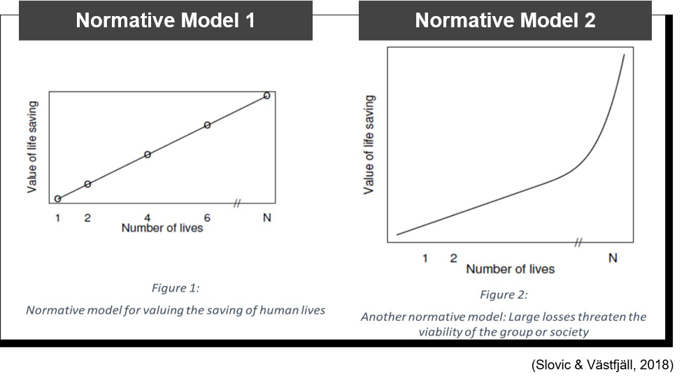 Slovic and Västfjäll’s groundbreaking work teaches us a lot about how we value life.5 To put it simply, in an ideal world, every life is equal and holds the same value. So if, say, you were to donate money to save lives, where the number of victims is N and X is the dollar amount it takes to save one person, then the total response that should be expected, R would be quantifiable as R = X times N. This gives us a linear graph, as seen below on the left.